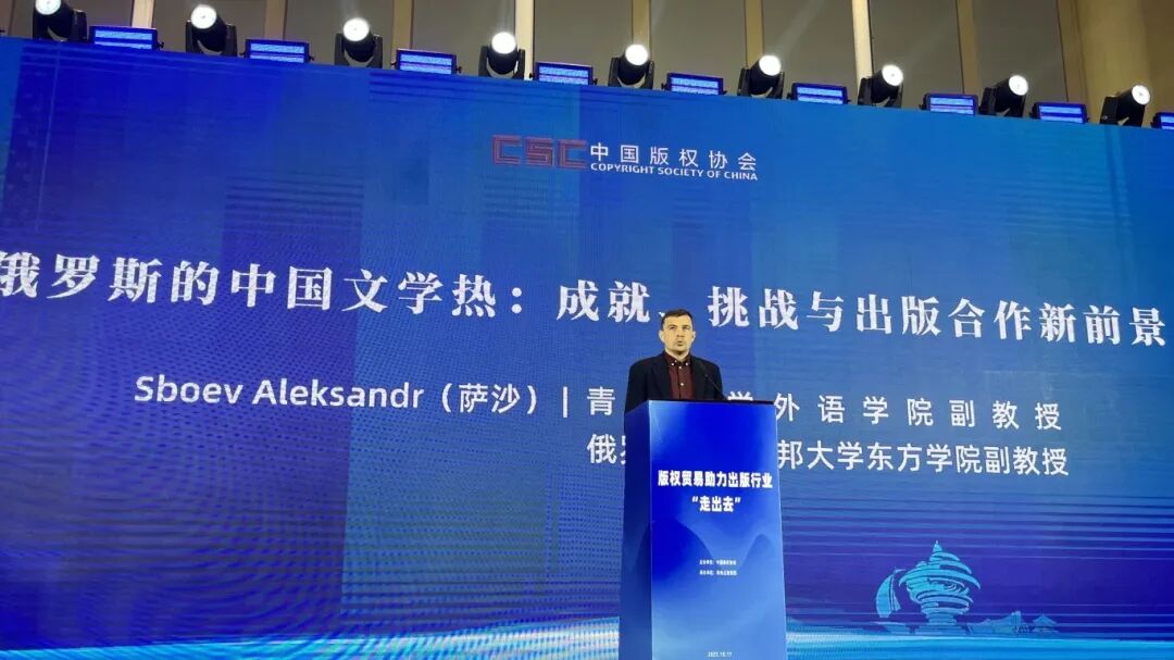 2025年10月17日,由中国版权协会举办,青岛出版集团承办的“版权贸易助力出版行业'走出去'学术研讨会”在青岛成功举办。我院副教授萨沙(Sboev Aleksandr)应邀出席,并以“俄罗斯的中国文学热:成绩、挑战和新的合作机会”为题做主题报告,青岛出版集团党委副书记、总编辑李海涛主持会议。