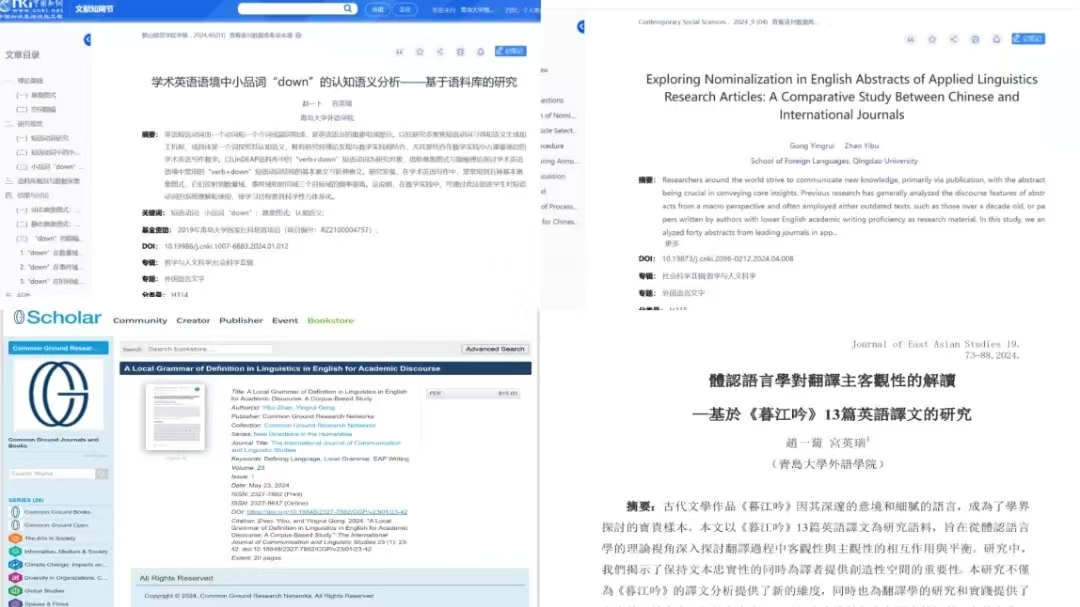 在导师认知语言学与文体学方向研究的影响下,我逐步确立了以认知语言学为理论基础,融合心理语言学实验、语篇分析、翻译研究与语料库实证方法的研究视角,尝试从语言现象中挖掘认知规律,并将其服务于教学与实践。围绕这一研究路径,导师与我合作开展多项实证研究:我们在AMI期刊 Contemporary Social Sciences上发表了关于中外应用语言学期刊摘要中名词化策略对比的研究,揭示了文化背景对学术表达方式的深层影响。我们基于语料库研究定义句的局部语法模型,补充并完善了既有的定义标记系统,为学术开元网站登录入口写作的教学与研究提供了结构化路径,相关成果发表在Scopus-Q3期刊 The International Journal of Communication and Linguistic Studies上。此外,我们将体认语言学视角引入古典诗歌翻译研究,探讨译者在主客观性之间的动态调节;同时也关注认知语义与教学实践的结合,以“down”为例分析其在学术语篇中的图式结构与隐喻路径,为词汇教学提供理论支持。