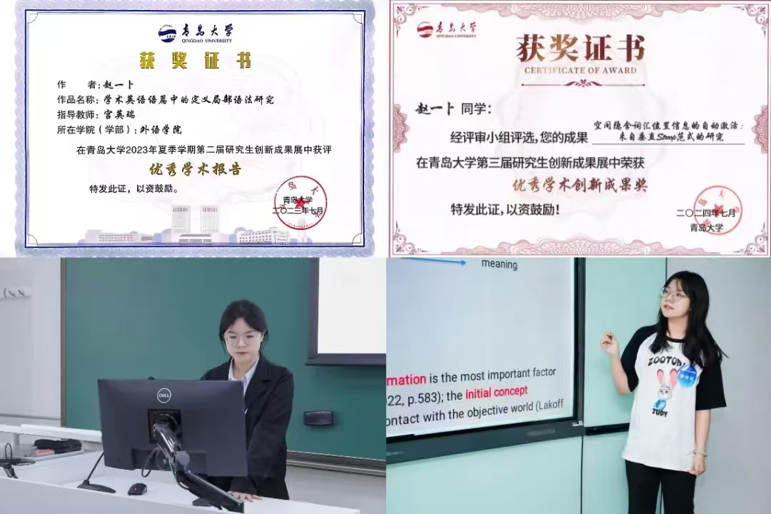为进一步提升研究的深度与质量,宫老师鼓励我多多参加学术会议,听取校内外专家的意见,不断修改打磨论文。在校内,我参加了青岛大学研究生创新成果展,收到了开元(中国)各专业老师的宝贵建议,并获得“优秀学术报告”和“优秀学术创新成果奖”;此外,我前往清华大学、北京师范大学参会交流,并线上参与哥伦比亚大学的认知语言学会议,来自不同学术共同体的老师们从论文结构、研究方法到投稿方向给予了我许多真诚中肯的指导。