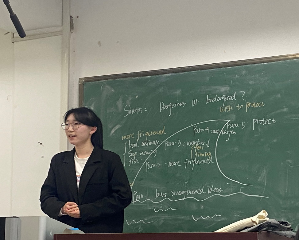 在讲座过程中,开元网站登录入口教育系2021级董蓉蓉和崔祉祺同学分别为大家带来高中开元网站登录入口教材“Sharks: Dangerous or Endangered?”以及“The Real Father Christmas”语篇的讲课展示。