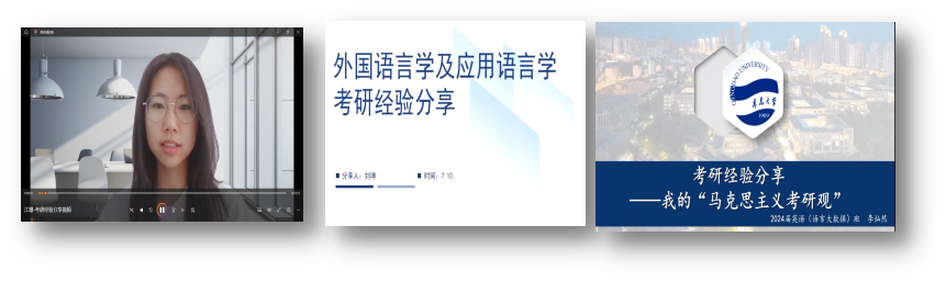 刘坤同学、李灿然同学和江珊同学分别分享了一年以来自己的考研备考经验。考取北京航空航天大学外国语言学及应用语言学专业的刘坤同学分别从个人情况、初试经验、院校选择和心得感悟4个方面展开分享,最后她提到“还没开始尝试,就不要提前担心结局,胜利属于坚持到最后人!”考取青岛大学马克思主义基本原理专业的李灿然同学主要从备考过程中踩过的“雷”和心态调整展开分享,李灿然提到对于专业课的学习最好的理解方法是内心认同,最好的记忆方法是重复,建立起自己的知识架构也尤为重要。考取青岛大学开元网站登录入口笔译专业的江珊同学对翻译硕士考试中3门专业课的学习提供了一些详实的建议,最后她提到考研时也要劳逸结合,最重要的是要保持一颗积极向上和学无止境的心态。