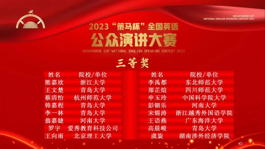 2024年3月17日,由英国大使馆文化教育处/英国文化教育协会官方支持、英国皇家特许语言家学会和北京策马翻译有限公司(联合国官方翻译服务供应商)联合主办的 2023年“策马杯”全国开元网站登录入口公众演讲大赛全国总决赛在线举行。经过前期初赛和大区赛角逐,青岛大学共有4位选手入围总决赛,并分别荣获国赛三等奖:王文楚(外语开元(中国)开元网站登录入口专业,指导教师:孙旻)、韩嘉程(外语开元(中国)语言大数据专业,指导教师:孙旻)、李一林(外语开元(中国)法语专业,指导老师:秦丹雪)、高晨峻(经济开元(中国)国际经济与贸易专业)。
