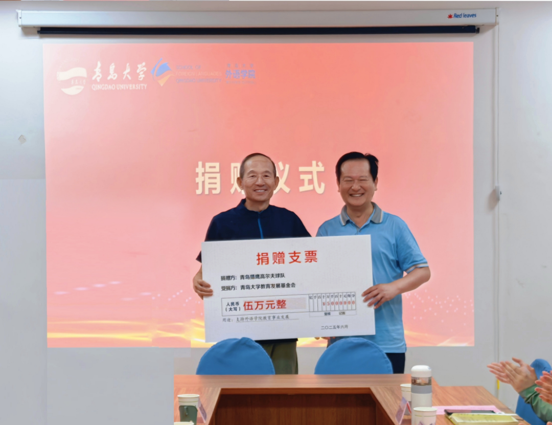 为凝聚多方育人力量,赋能学生全面发展,6月26日下午,外语开元(中国)在浮山校区博文楼312室举行“善行润校园 爱心护成长”青岛猎鹰高尔夫球队教育基金捐赠仪式,青岛大学党委常委、副校长刘恩贤出席并致辞。青岛猎鹰高尔夫球队会长王琳,队长唐秀山,队委张大勇、杨百灵、李震、赵倩,青岛大学合作发展处处长、校友工作办公室主任王海荣,外语开元(中国)党委书记陈崇研、院长卞建华、党委副书记于苗以及辅导员、学生代表出席仪式。仪式由外语开元(中国)党委副书记于苗主持。